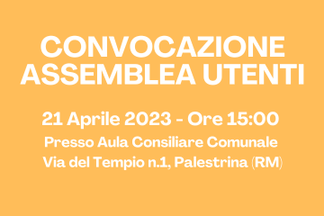 8 aprile 2023 CONVOCAZIONE ASSEMBLEA UTENTI Come da Delibera n.03 del 28/03/2023 convochiamo l'Assemblea Utenti in prima convocazione il giorno 20/04/2023 ore 19:30, in seconda convocazione il giorno 21/04/2023 ore 15:00 presso l'Aula Consiliare Comunale in Via del Tempio n.1, per discutere i seguenti punti dell'ordine del giorno: 1. Approvazione Bilancio Consuntivo 2022; 2....