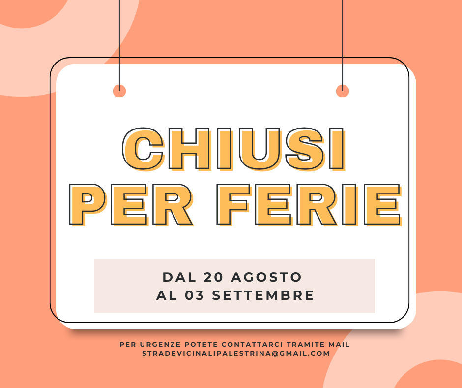 18 agosto 2025 Chiusura per ferie dal 19 agosto 2025 al 03 settembre 2025Per urgenze potete contattarci tramite mail:stradevicinalipalestrina@gmail.com